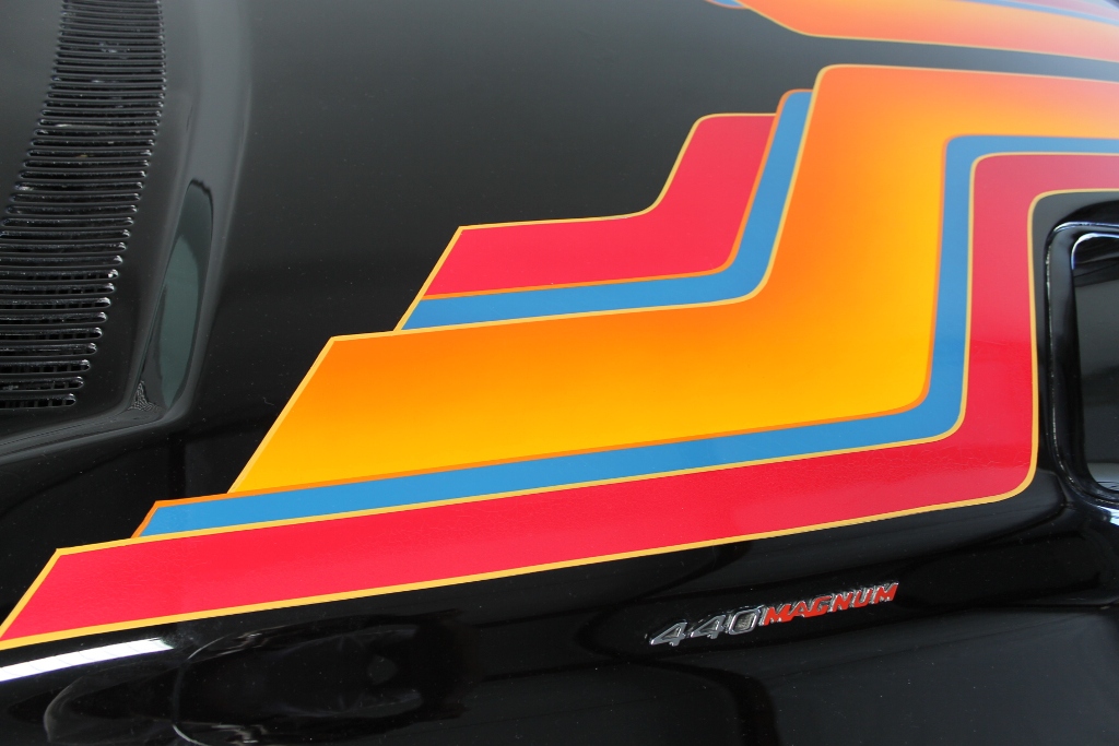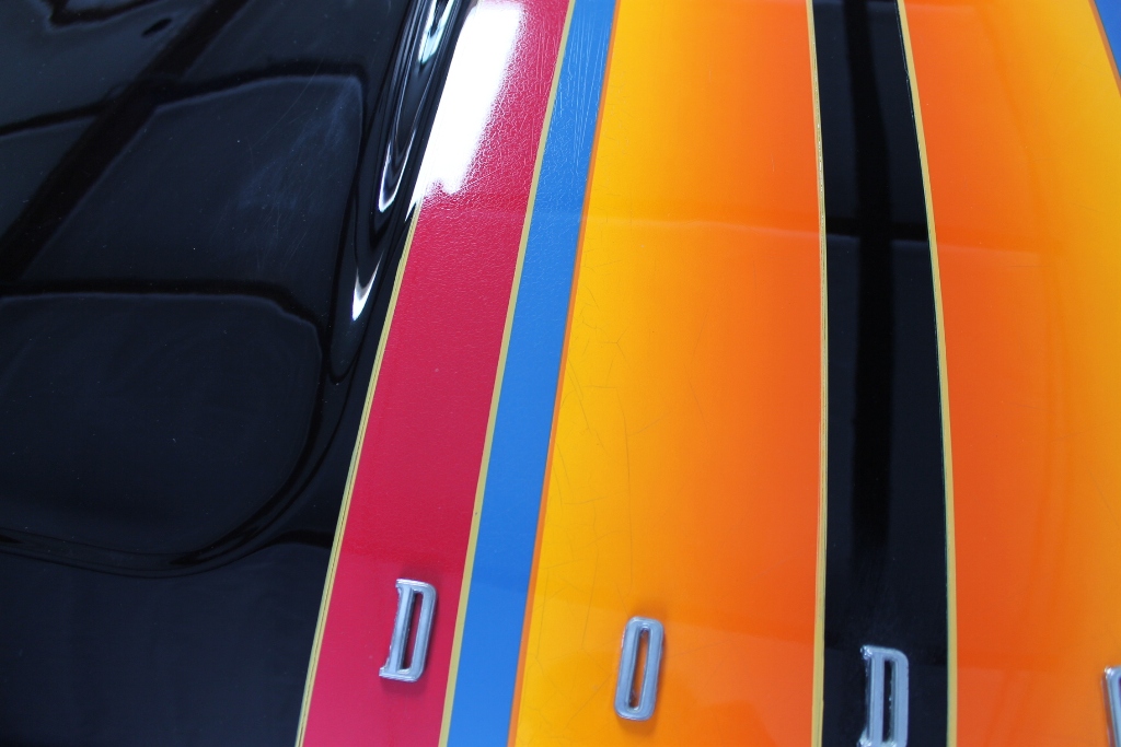 The colors are vibrant and beautiful, with no fading whatsoever. There are some micro-cracks showing in the color sections, you can see them near the “O” of DODGE, and above in the cranberry paint. The Black sections have nothing like this, it is SPECTACULAR and high quality and nice.